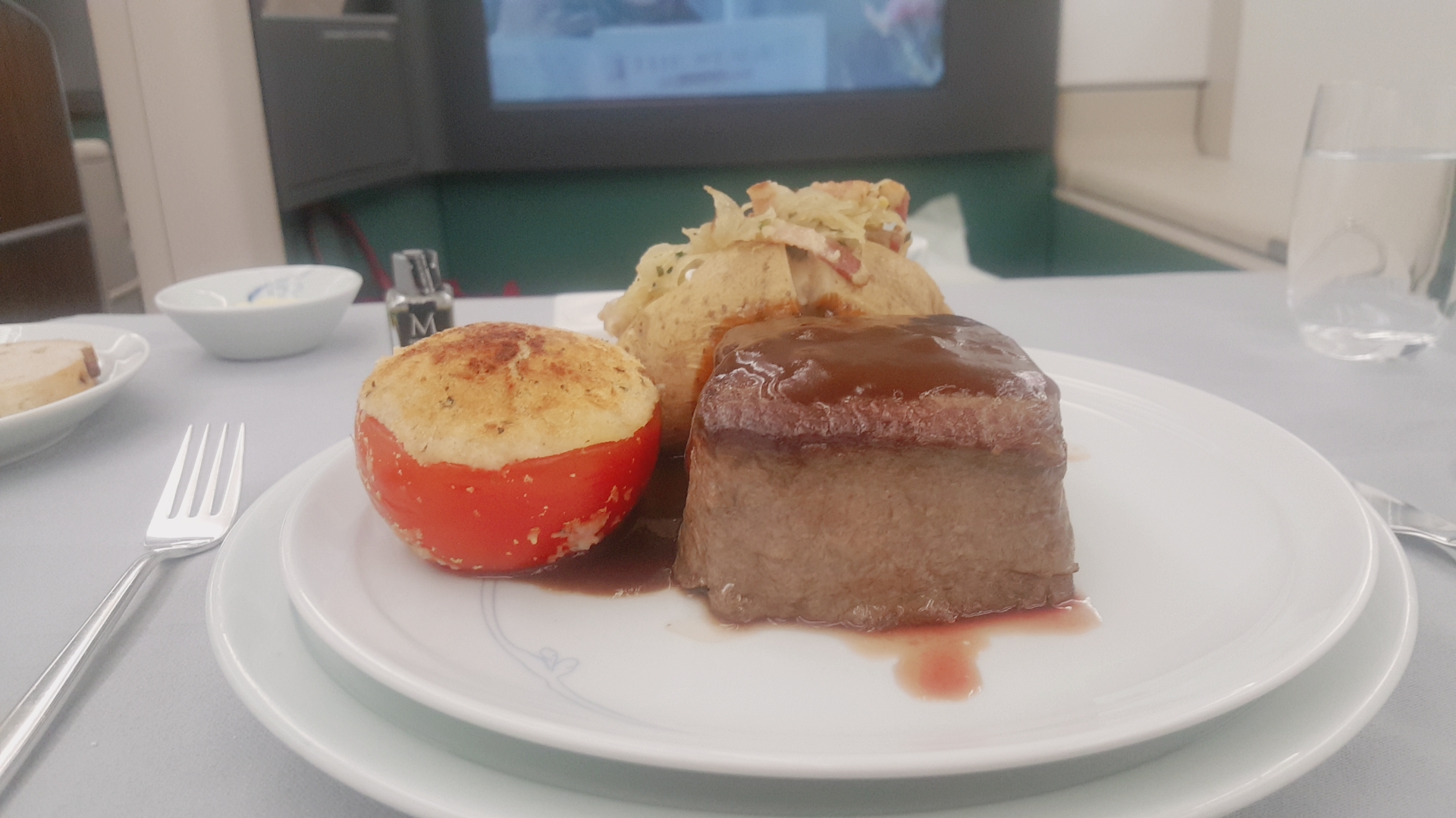 기내식은 인천출발 퍼스트라면 한식정찬이 좋은데 저녁시간에 너무 과한것같아서 그냥 스테이크로 선택했다.