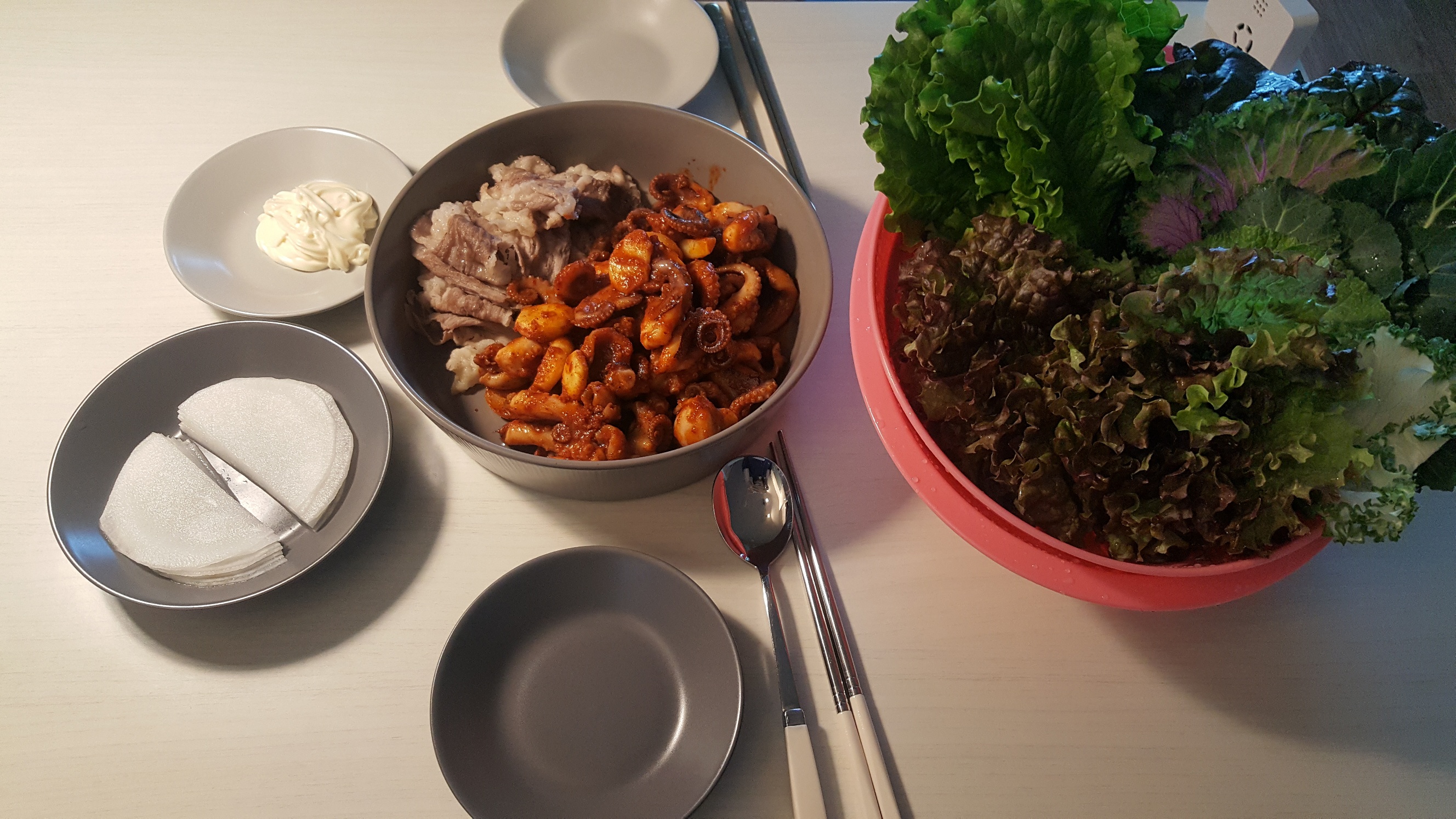 쭈꾸미랑 차돌박이, 무쌈, 야채, 마요네즈를 준비해서 먹고