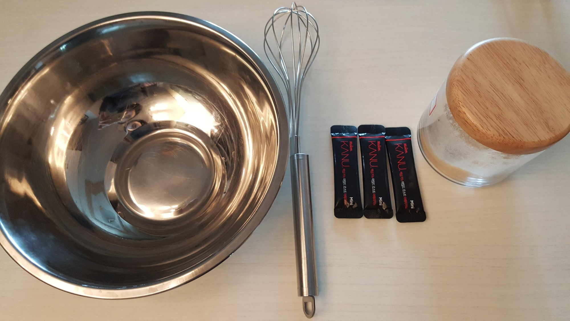 보울, 거품기, 설탕, 커피가루, 뜨거운물 + 우유 180ml정도