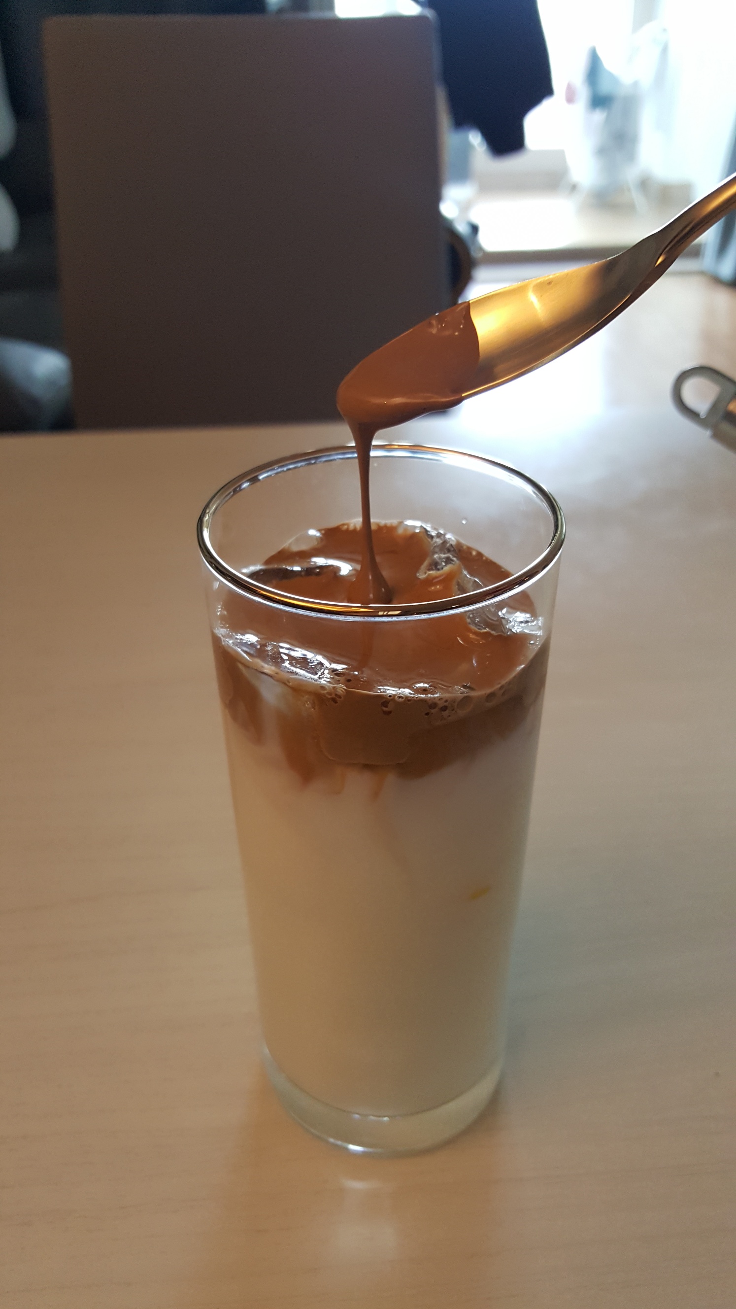 우유랑 섞이도록 저어주고, 달고나커피 마시기 :)