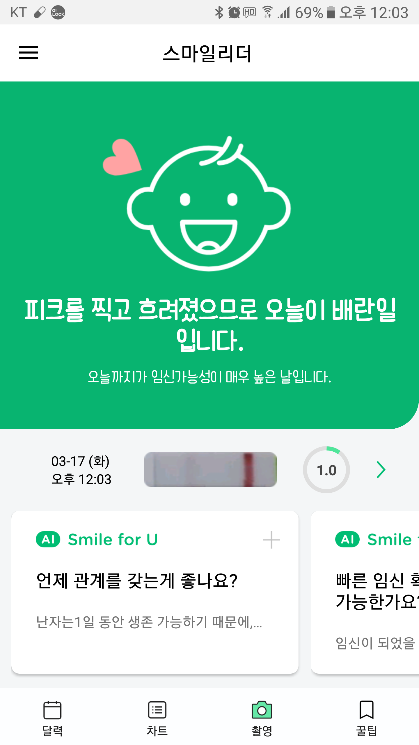 배란일이되면 이렇게 스마일 리더 어플에서도 배란일이라고 알려준다