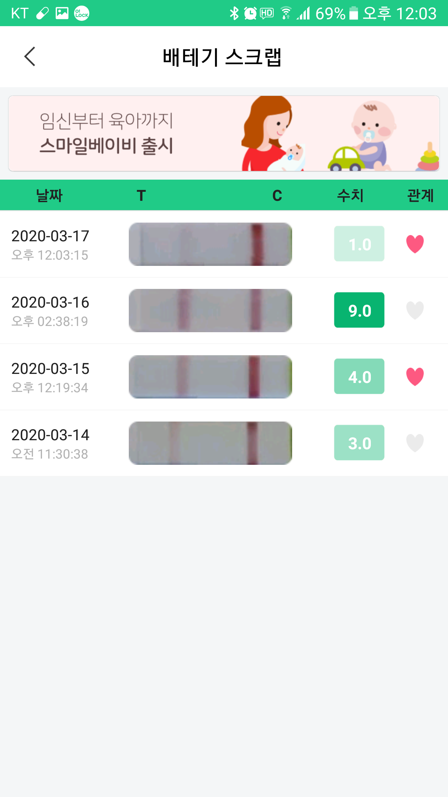 '스마일 리더'라는 어플을 사용하면 검사한 배테기를 사진촬영을 하면 알아서 수치로 계산해서 알려준다.^^