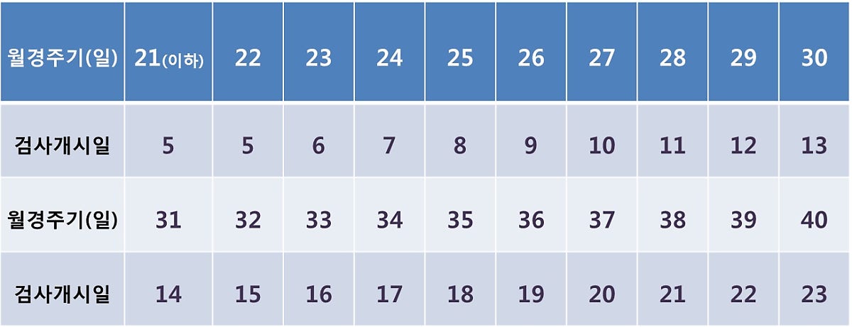 생리주기가 불규칙하다면 최근 3개월 동안의 평균 주기를 계산 한 후, 위의 표를 보고 검사를 진행하면 될것같다.
