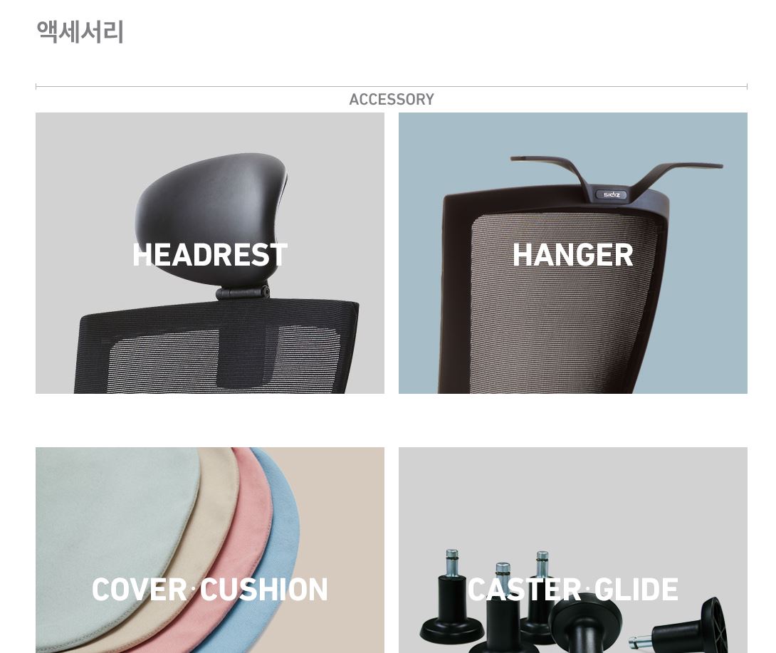 먼저, 시디즈 홈페이지에서 '액세사리' 메뉴에 들어가시면 구매가 가능한 부품들 목록이 나옵니다.