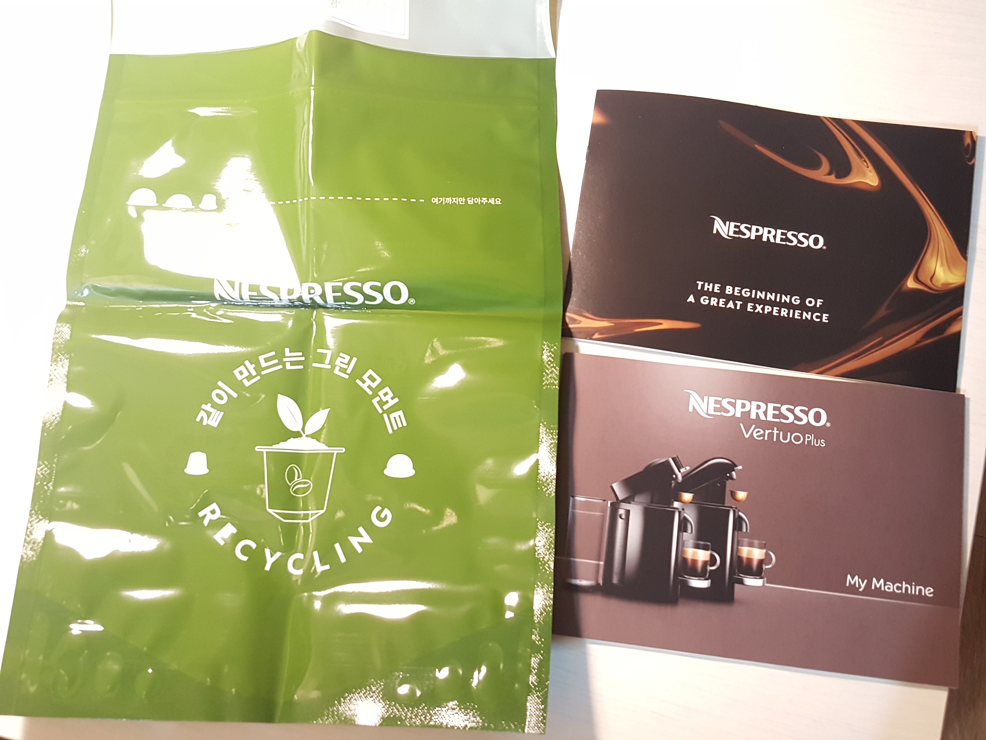 위 사진 초록색 비닐백에 네스프레소 캡슐을 모아서 네스프레소 부티크에 갖다주어도되고요,