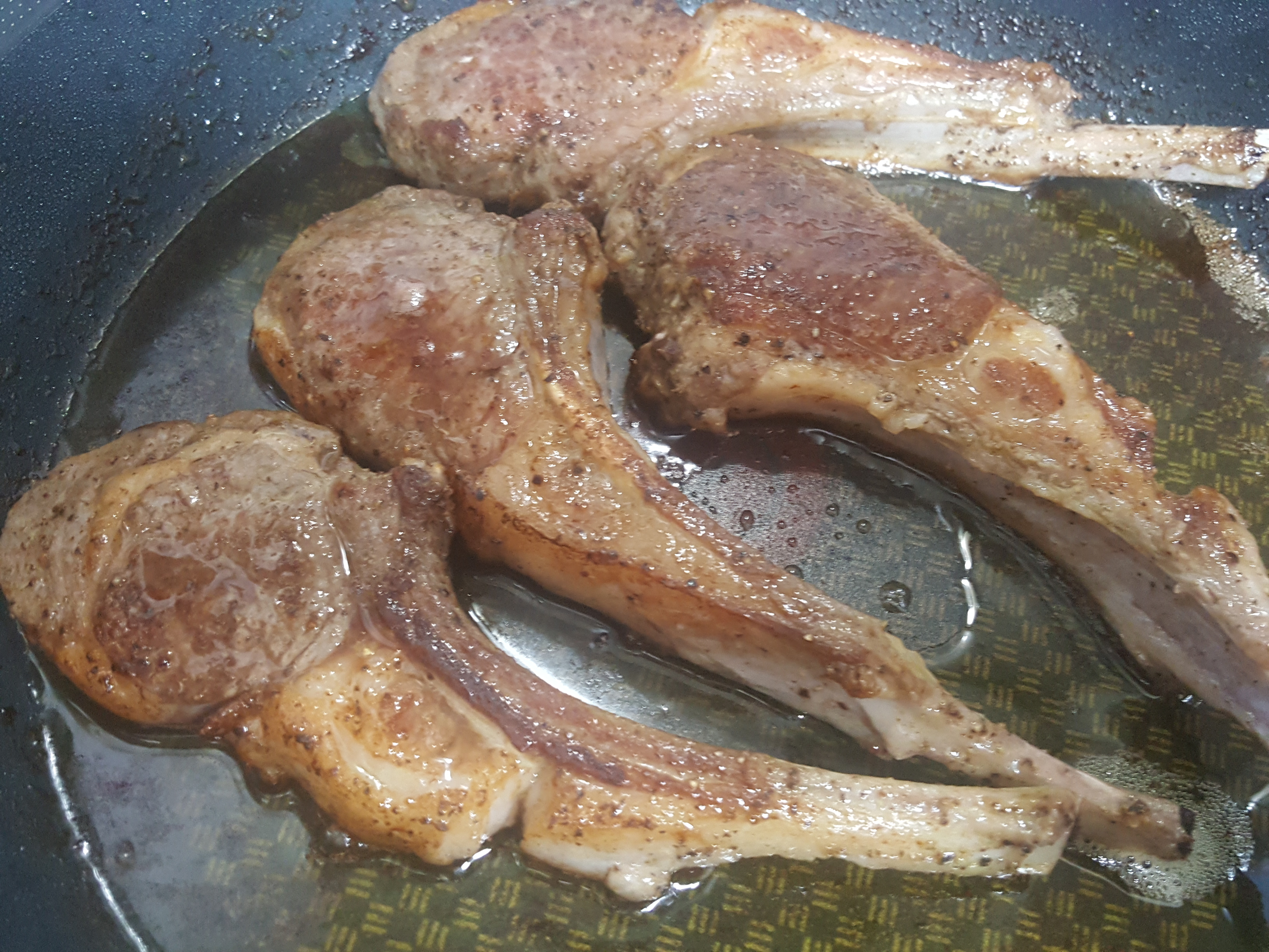 먼저, 달궈진 팬에 올리브유를 두르고 충분히 뜨거워졌으면 양갈비를 올립니다.