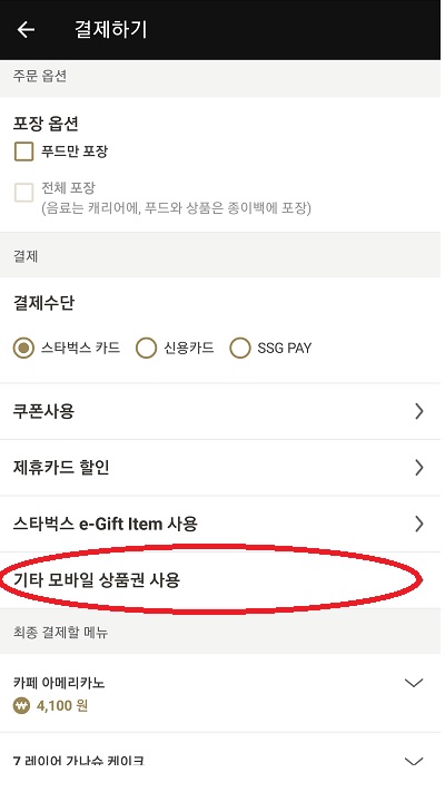 4. 결제화면으로 넘어오셨죠? 결제 수단에서 '기타 모바일 상품권 사용' 버튼을 눌러주세요.