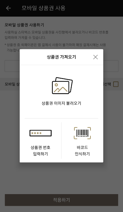 상품권 이미지 불러오기, 상품권 번호, 바코드 중에서 편하신 방법을 선택해주세요.