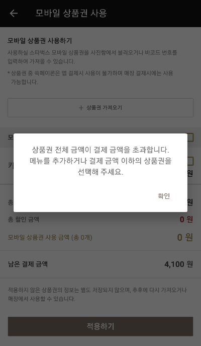 "상품권 전체 금액이 결제금액을 초과합니다. 메뉴를 추가하거나 결제금액 이하의 상품권을 선택해주세요."