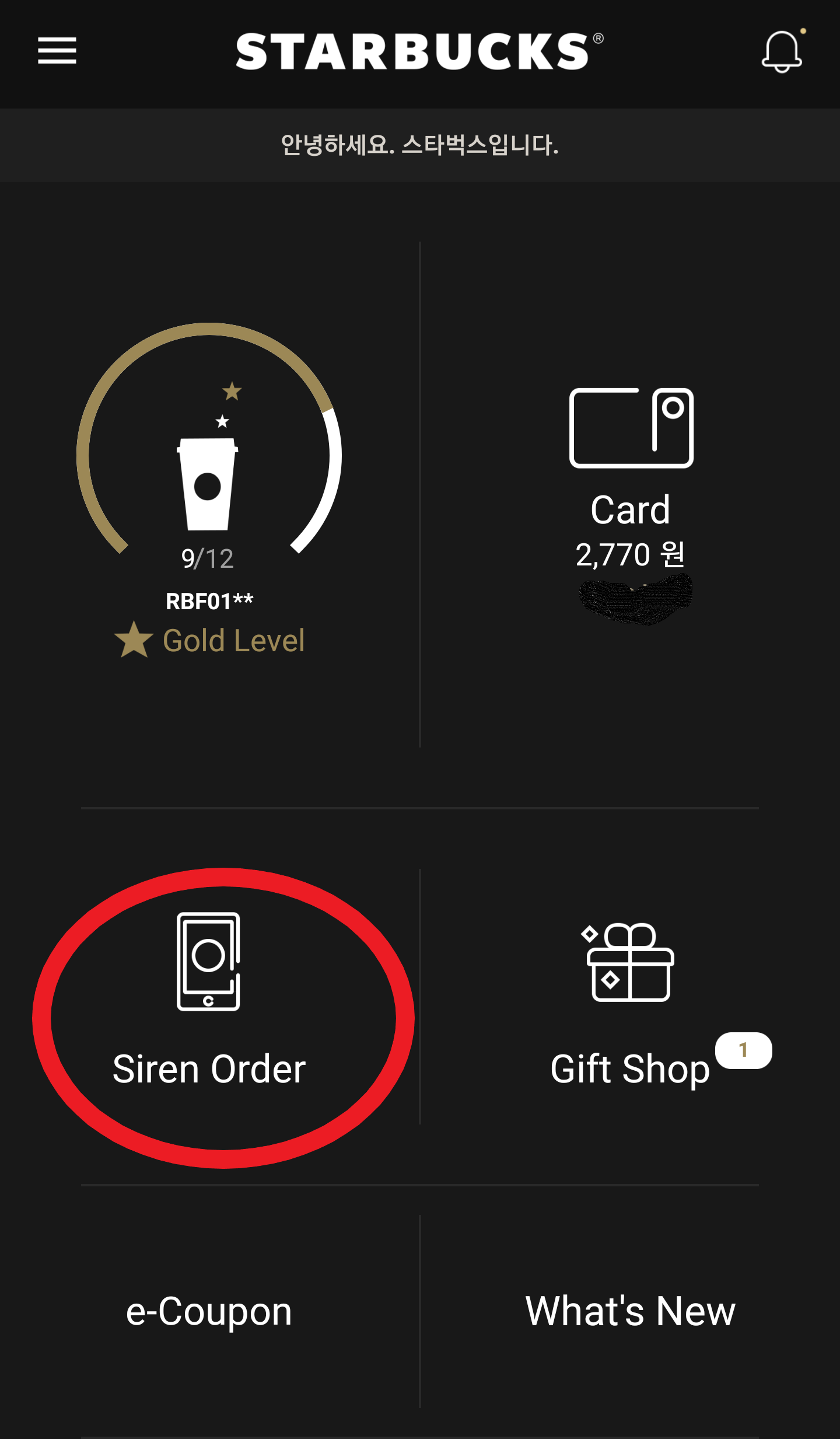 2. 스타벅스 앱을 켜고 사이렌 오더로 들어가주세요.