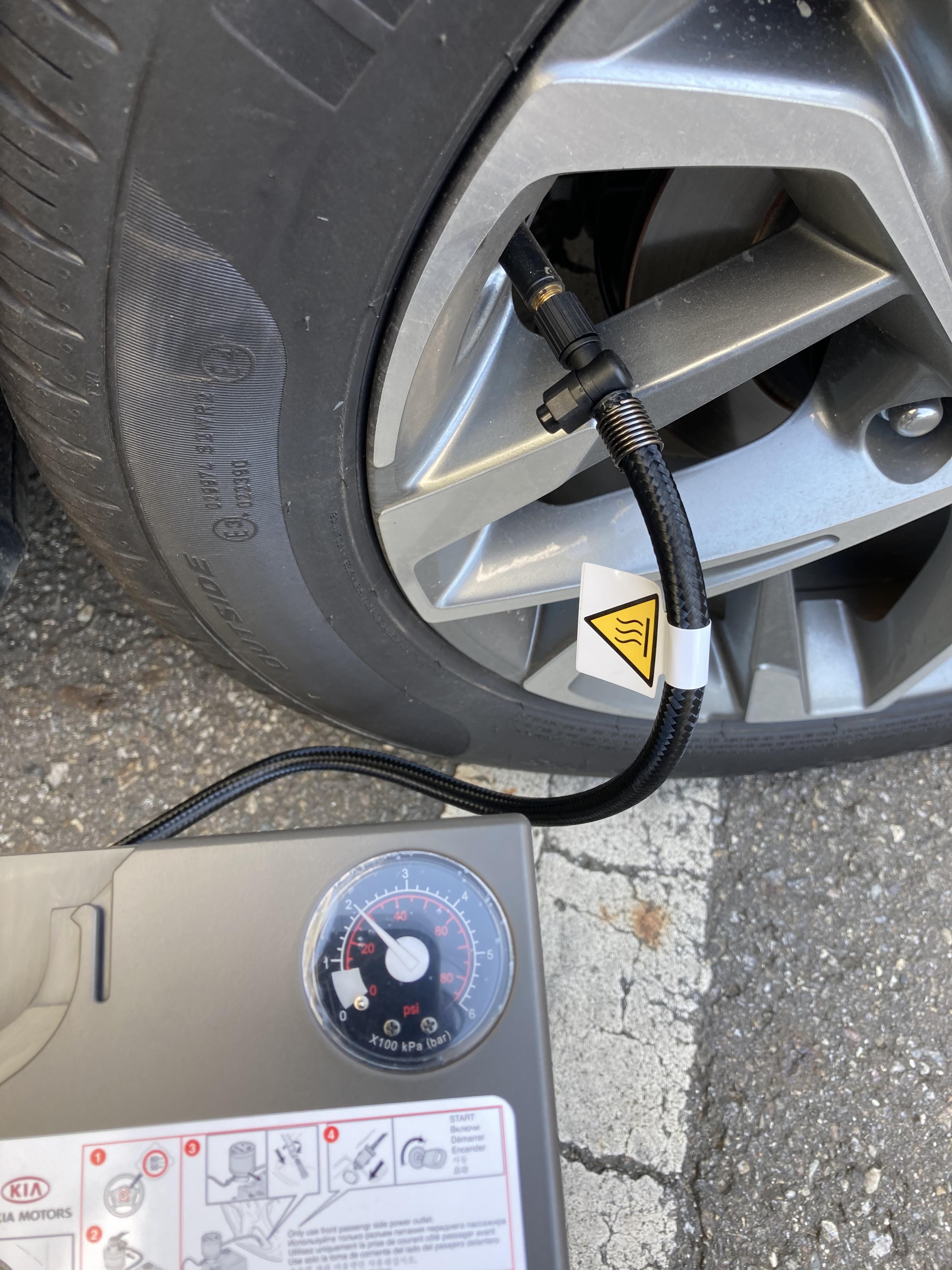 시거잭 라인이 충분히 길기 때문에 바퀴 4개 모두 커버가 가능합니다. 타이어의 고무 마개를 열고 타이어 수리킷의 공기주입 호스를 결합해 줍니다.