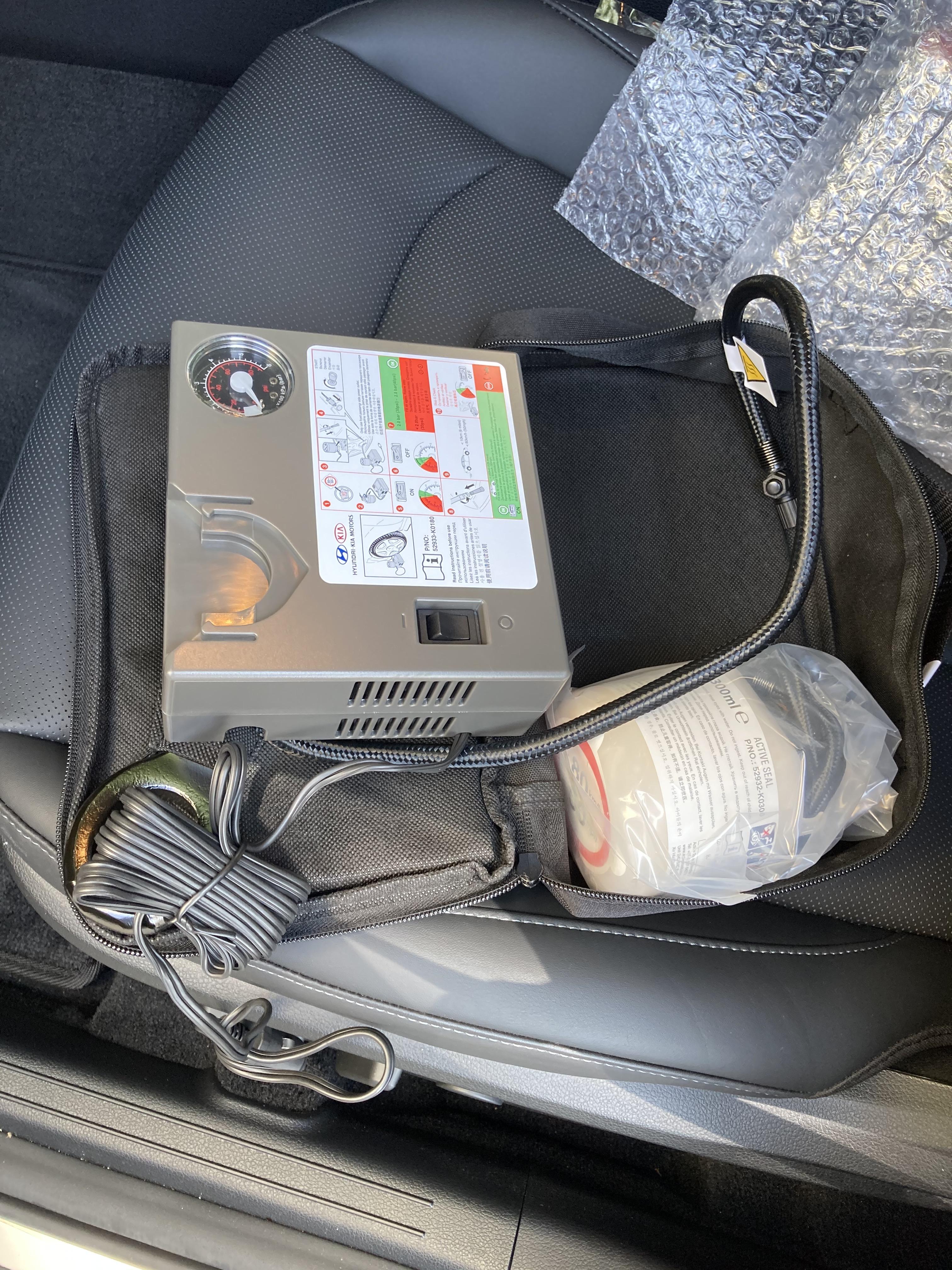 타이어 펑크 수리 키트를 열어보면 미니 콤프레셔가 있고 펑크날 때 쓰는 실란트 통이 있는데 공기만 주입하실 거면 공기 주입기(콤프레셔)만 사용하시면 됩니다.