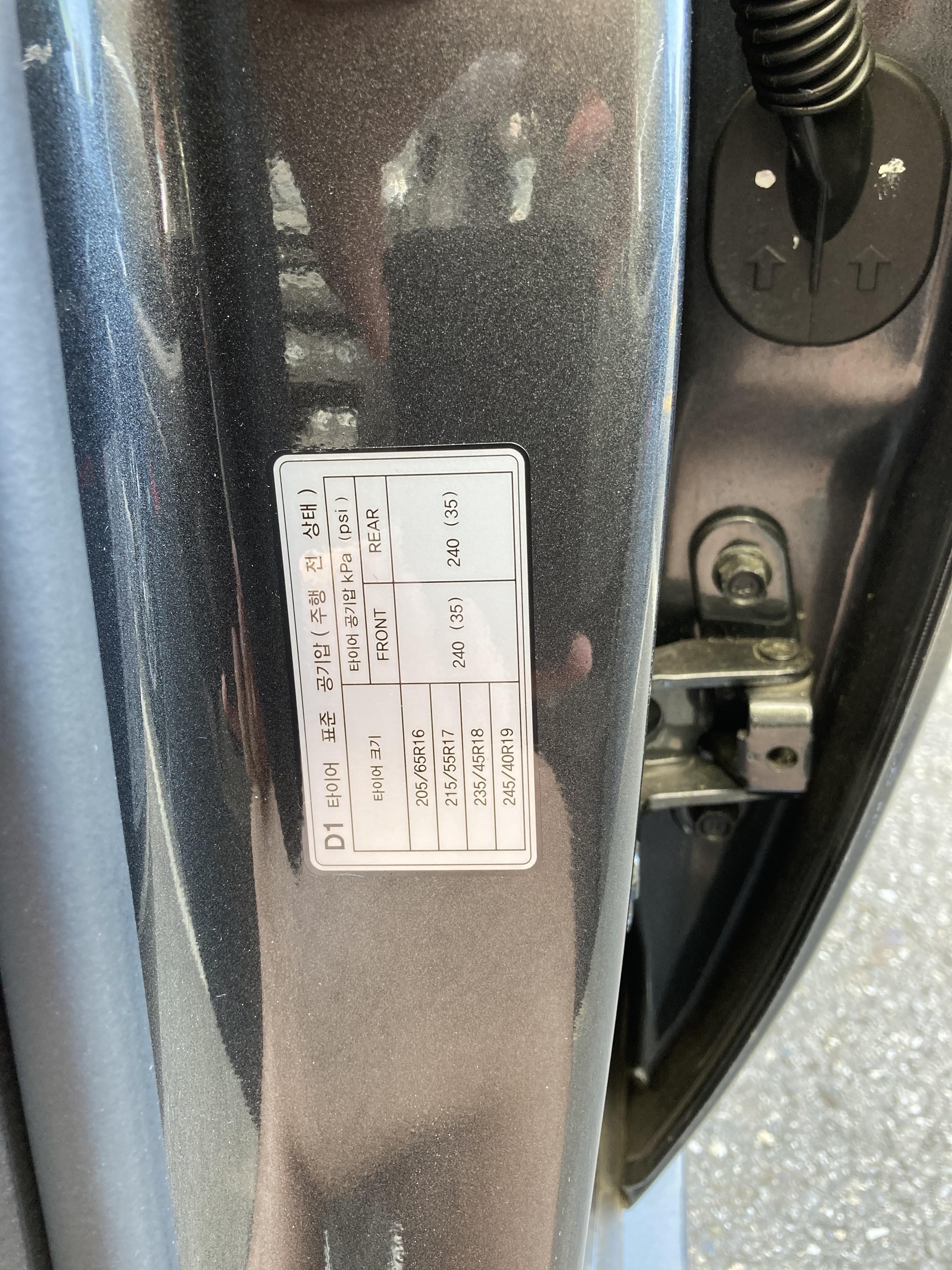 자신이 타고 있는 차량에 얼마만큼의 공기압을 주입해야 할지 모르시겠다구요? 운전석 문짝을 열어보면 아래 사진과 같이 해당 차량의 적정 공기압 정보가 있습니다. 제 차량은 소나타 센슈어스 모델인데 전/후 타이어 모두 35 psi 입니다. 타이어 공기압은 주행 후 측정하면 타이어 내부 공기가 팽창돼 높게 나올 수 있기 때문에 반드시 주행 전 측정하세요.