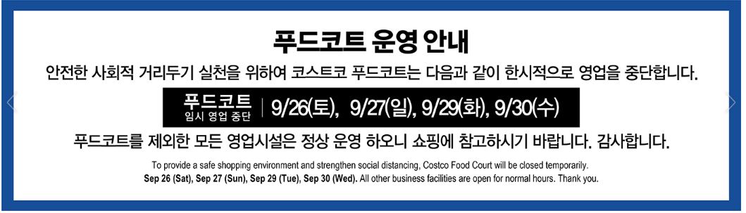 코로나19로 인한 사회적 거리두기 실천을 위해서 코스트코 푸드코트가 한시적으로 영업을 중단합니다.
