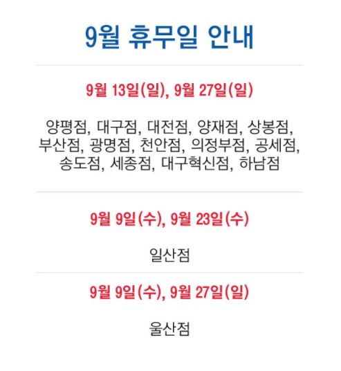 9월 27일(일) 휴무일 영업점