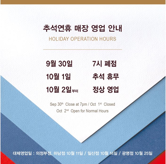 추석 연휴기간 동안 영업시간이 변경되었습니다.