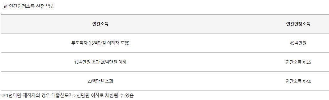 연간소득 산정방법은 위와 같으며, 1년 미만 재직자의 경우 대출한도가 2천만원 이하로 제한될 수 있습니다.