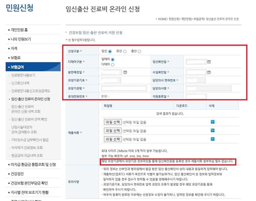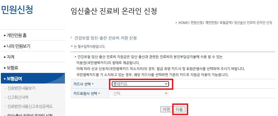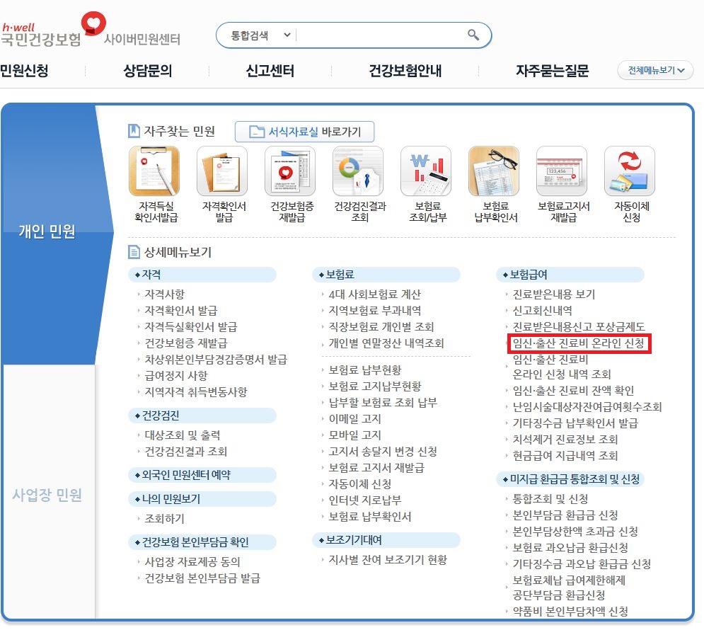 보험급여 -> '임신출산진료비 온라인신청' 메뉴를 눌러주세요.