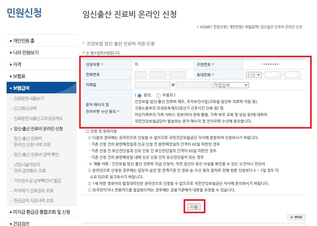 3. 신청자이름, 주민번호, 휴대전화는 입력되어 있을겁니다.