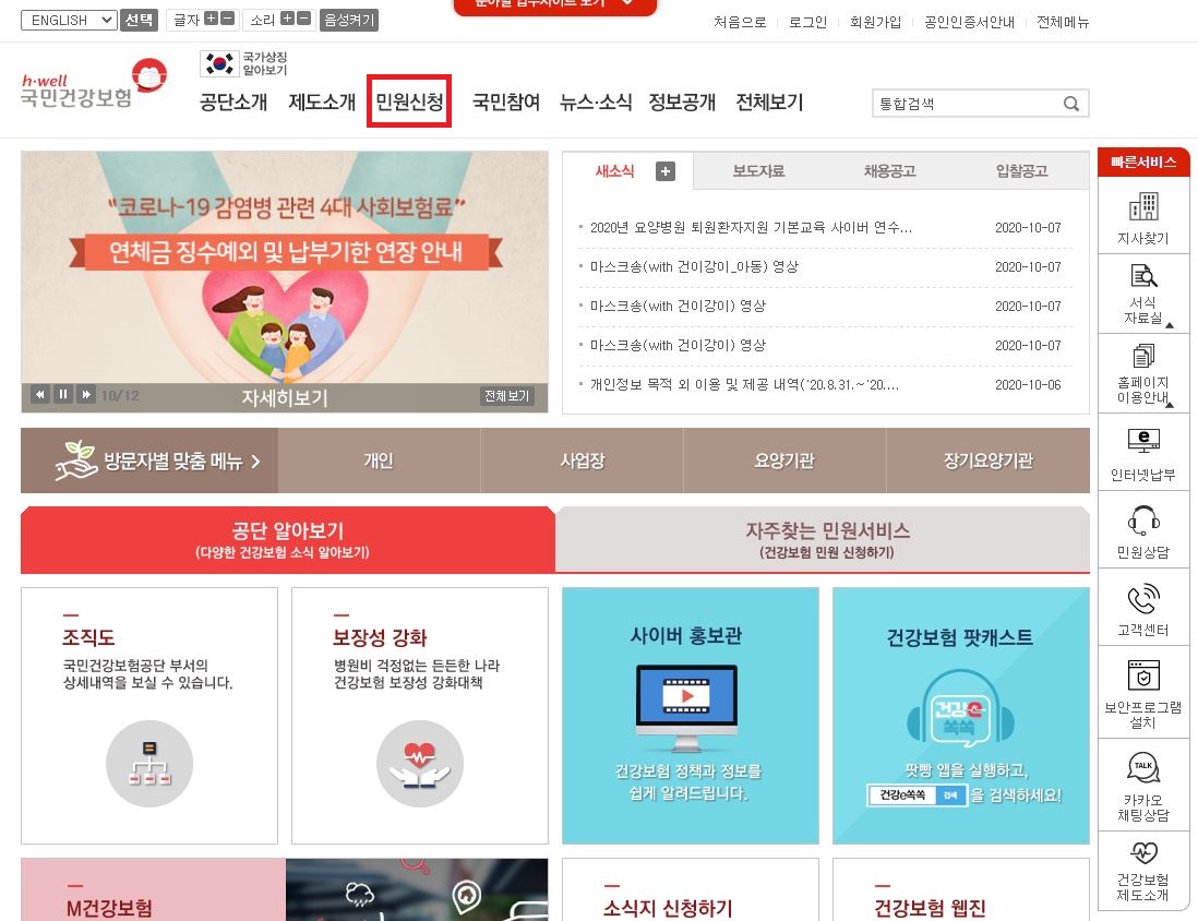 2. 개인민원으로 들어가셨으면, '국민건강보험공단 사이버민원센터' 창이 뜹니다.