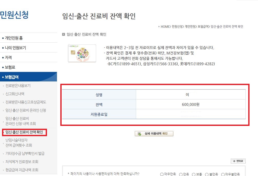 건강보험 사이버민원센터 홈페이지 -> 보험급여 -> 임신출산 진료비 잔액조회에서 확인이 가능합니다.