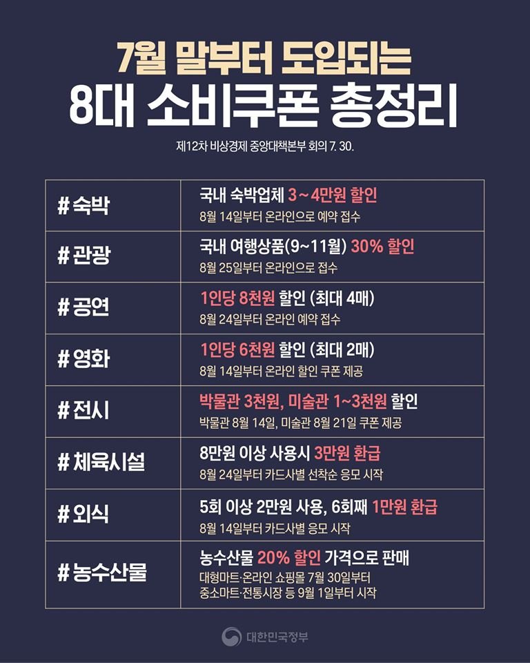 이 8대 쿠폰은 2020년 7월 30일부터 순차적으로 시행하여 지난 7월에는 농수산물 쿠폰을 제공하였고, 지난 8월에는 외식·영화·전시 등 쿠폰, 공연 및 체육 쿠폰, 관광 쿠폰을 제공하고자 하였습니다.