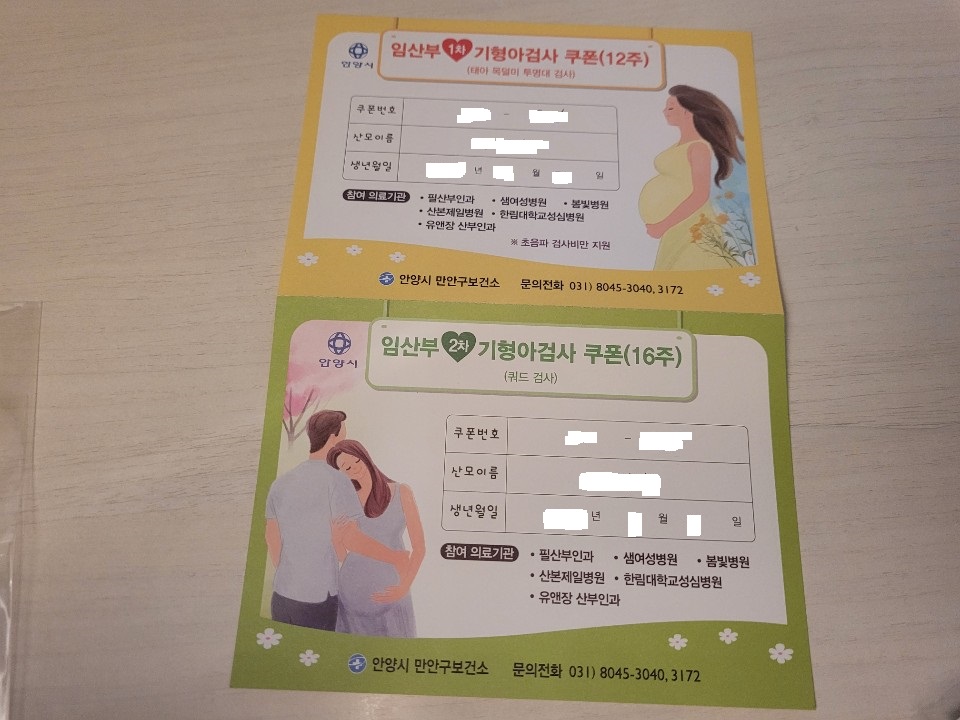 기형아검사는 1차, 2차 검사가 있는데 보건소에서 1차, 2차 모두 쿠폰을 발행해줍니다.