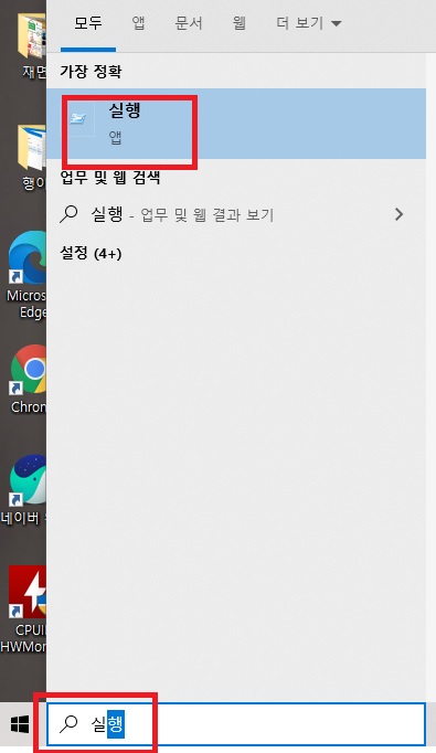 여기에 '실행' 이라고 쓰시면, 실행 도구가 나타납니다. . 또는 윈도우키+R버튼을 눌러서 실행앱을 띄웁니다.