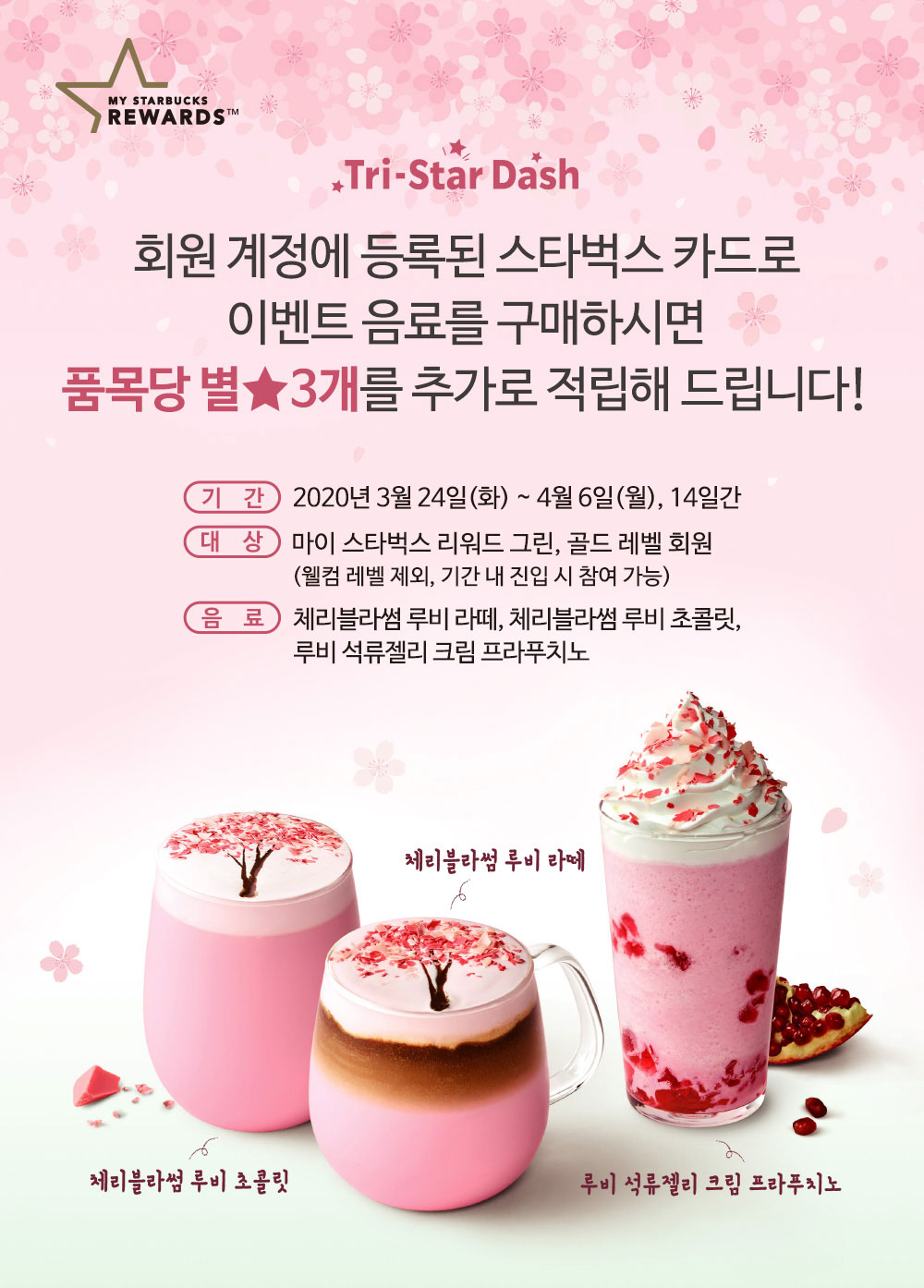 음료는 체리블라썸 루비라떼, 체리블라썸 루비 초콜릿, 루비 석류젤리 크림 프라푸치노가 있구요.