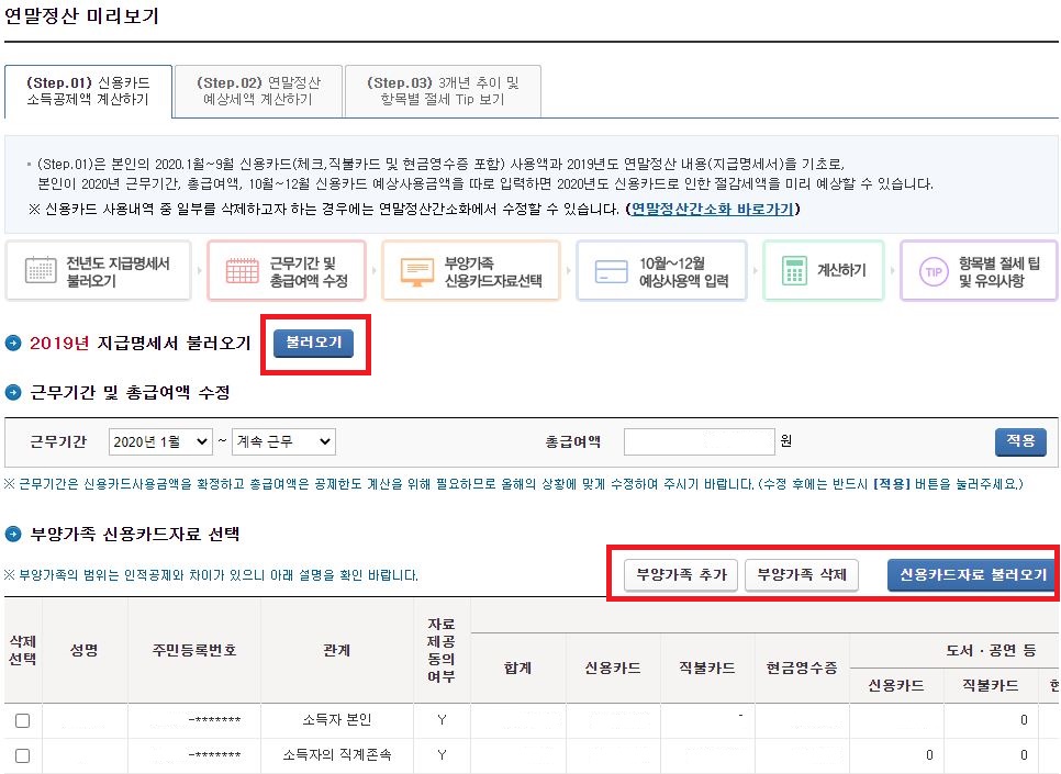 부양가족을 등록해야만 본인과 부양가족의 신용카드자료를 불러올수 있습니다.