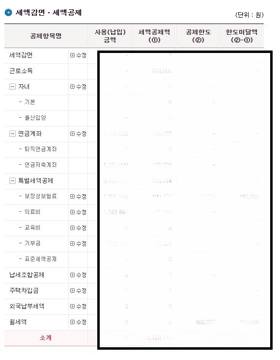 소득공제 부분, 세액 감면 부분에 자동으로 계산된 내용이 있을겁니다.