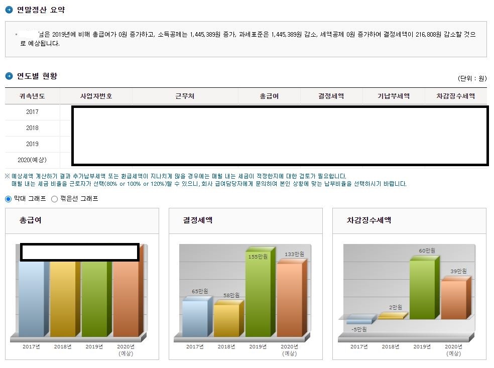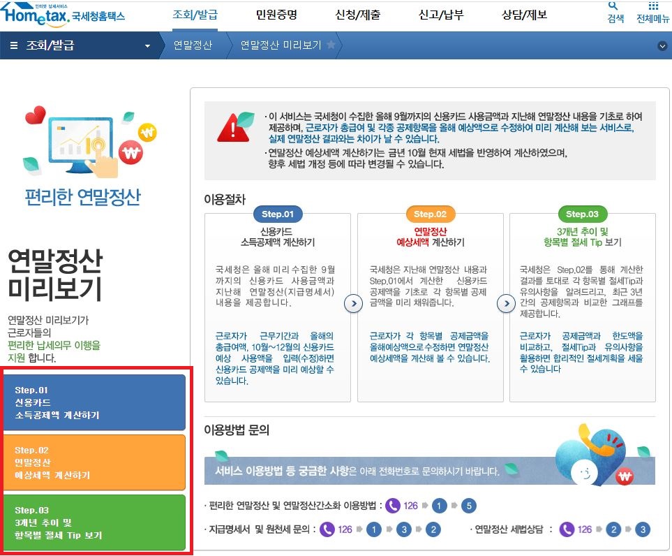 신용카드 소득공제액 계산 -> 연말정산 예상세액 계산 -> 3개년 추이 및 절세팁 보기