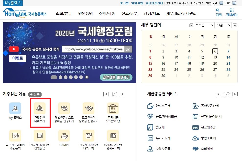 메뉴 중 '연말정산 미리보기' 메뉴를 클릭합니다.