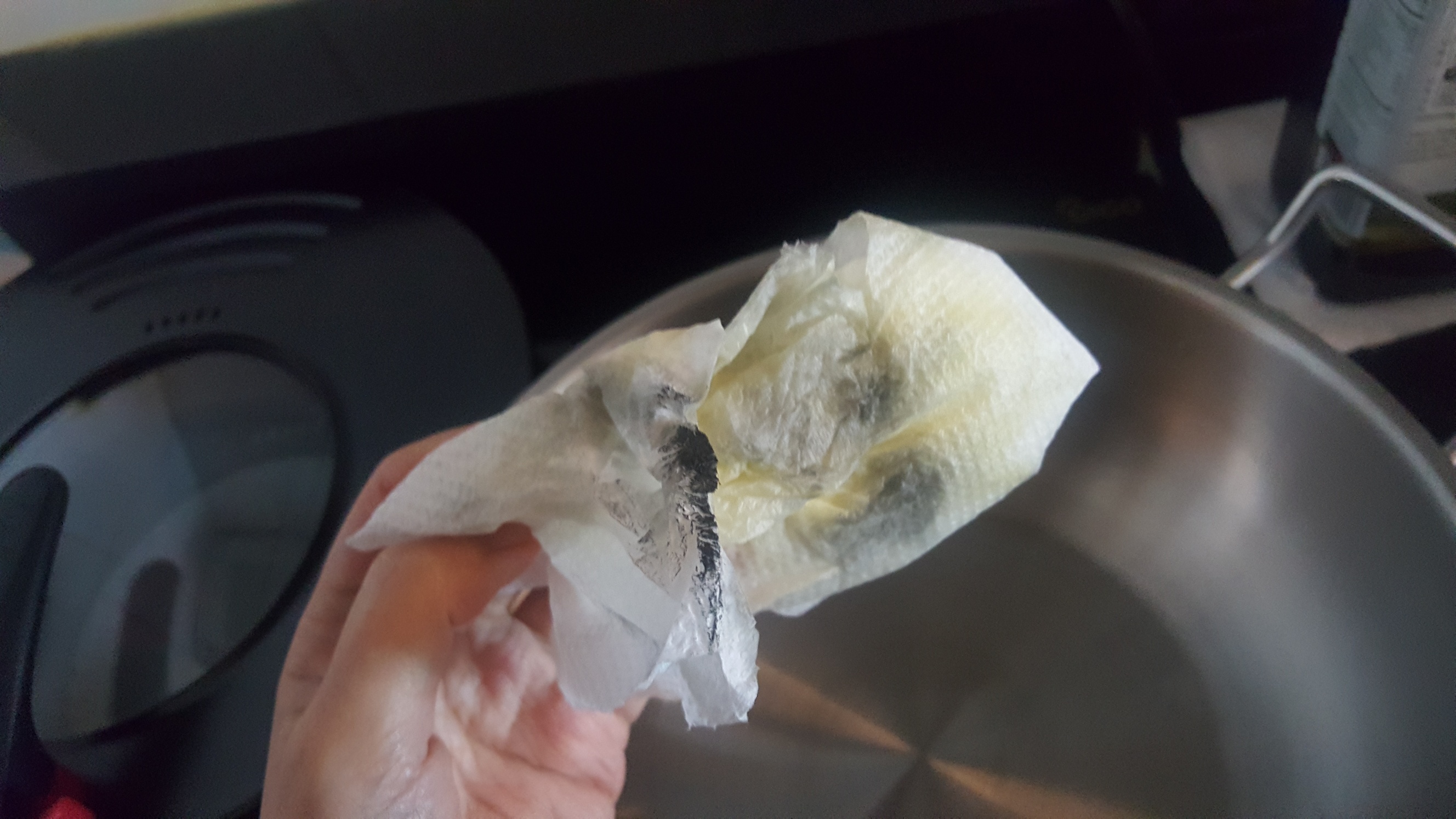 주방세제로 세척한 후에 다시 키친타월에 오일을 묻혀 닦아서 묻어나는게 있는지 다시한번 확인해보세요.