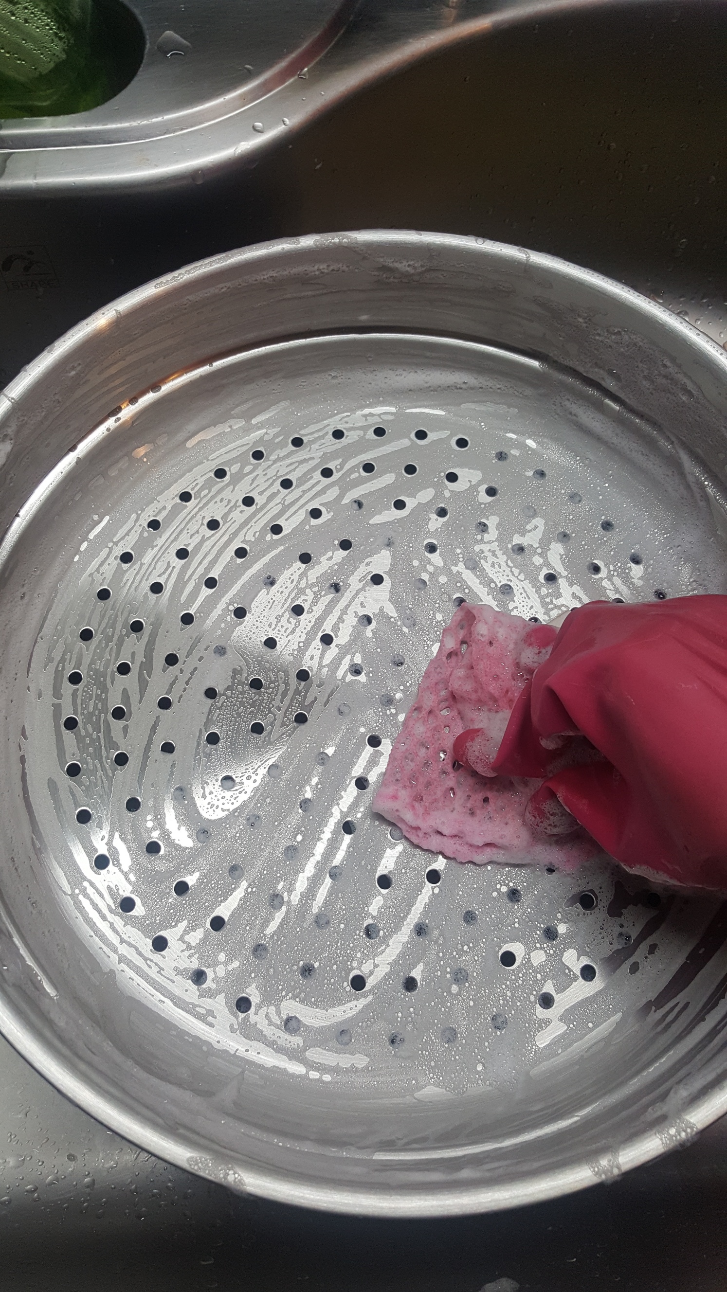 2. 기름을 묻힌 키친타월로 깨끗히 닦아준다음, 주방세제로 씻어줍니다.
