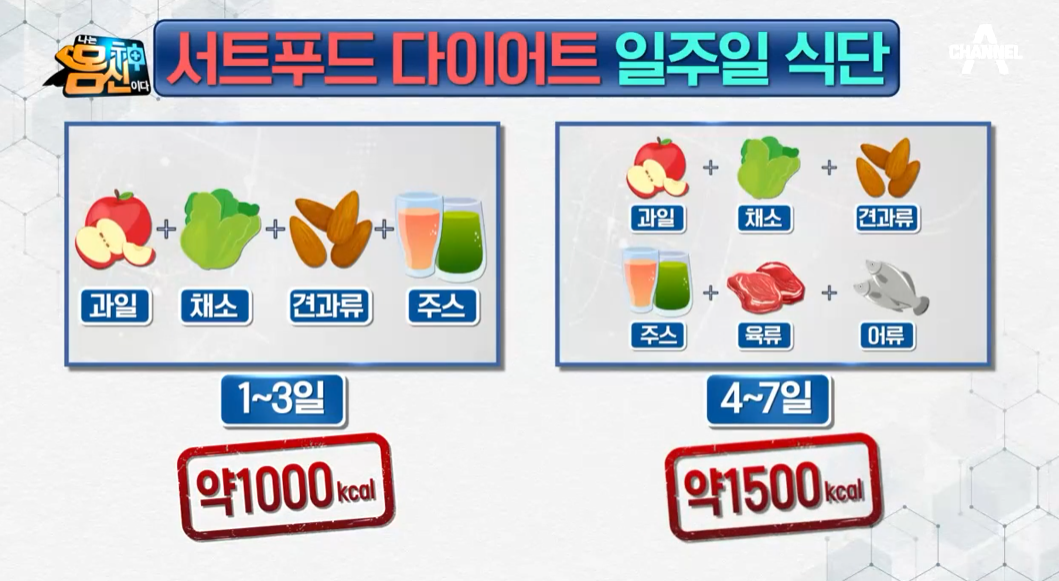 이렇게 혹독한 일주일이 지나면 서트푸드 식단을 칼로리 제한 없이 원하는 만큼 먹어도 됩니다.