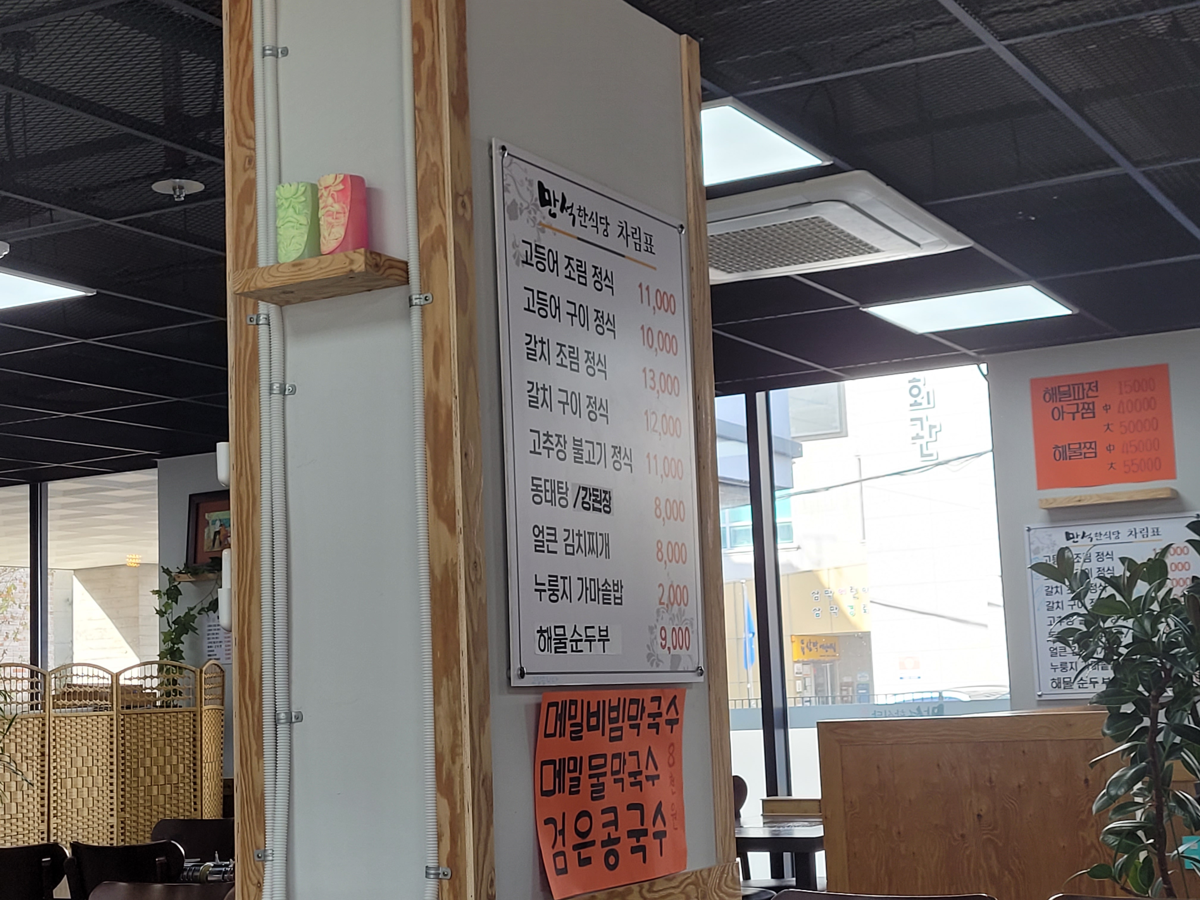 고등어 조림, 고등어 구이, 갈치조림, 갈치구이가 주력메뉴인것 같고, 고추장불고기 동태탕, 강된장, 김치찌개 등등