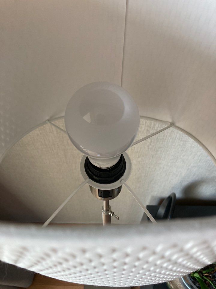스마트전구를 이케아(IKEA)에서 구매한 플로어스탠드에 장착했습니다. 전구 소켓은 E26 표준소켓으로 우리나라에서 범용으로 사용하는 규격입니다. 전구를 소켓에 돌려 끼우면 됩니다. 간단하게 설치할 수 있습니다.