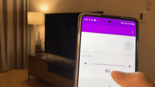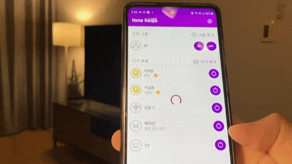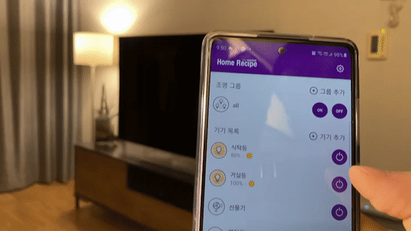 전용 앱 Home Recipe에 연결하였습니다. 전구와 가전 등록을 마친 상태이구요. 조명의 가장 본연의 기능인 켜고 끄기를 해보겠습니다. 조명 ON/OFF와 0~100% 밝기 조절도 가능합니다. 졸릴 때 스위치 끄러 일어서지 않고 불 끌 수 있는 게 가장 큰 장점입니다.