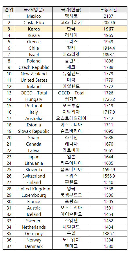 3위는 1,967시간으로 대한민국, 우리나라 입니다. 급격한 경제성장도 이루고 선진국 반열에 들어가는 국가이긴 하지만 여전히 노동시간이 깁니다.