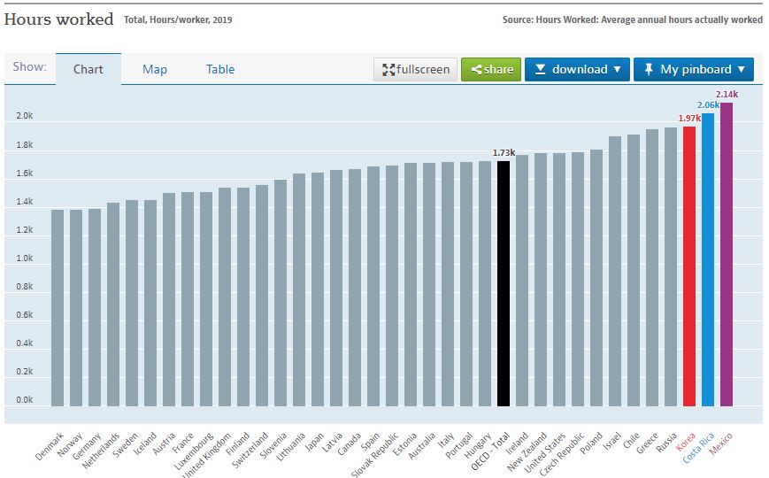 OECD 2019년 국가별 노동시간 순위를 알아보도록 하겠습니다.