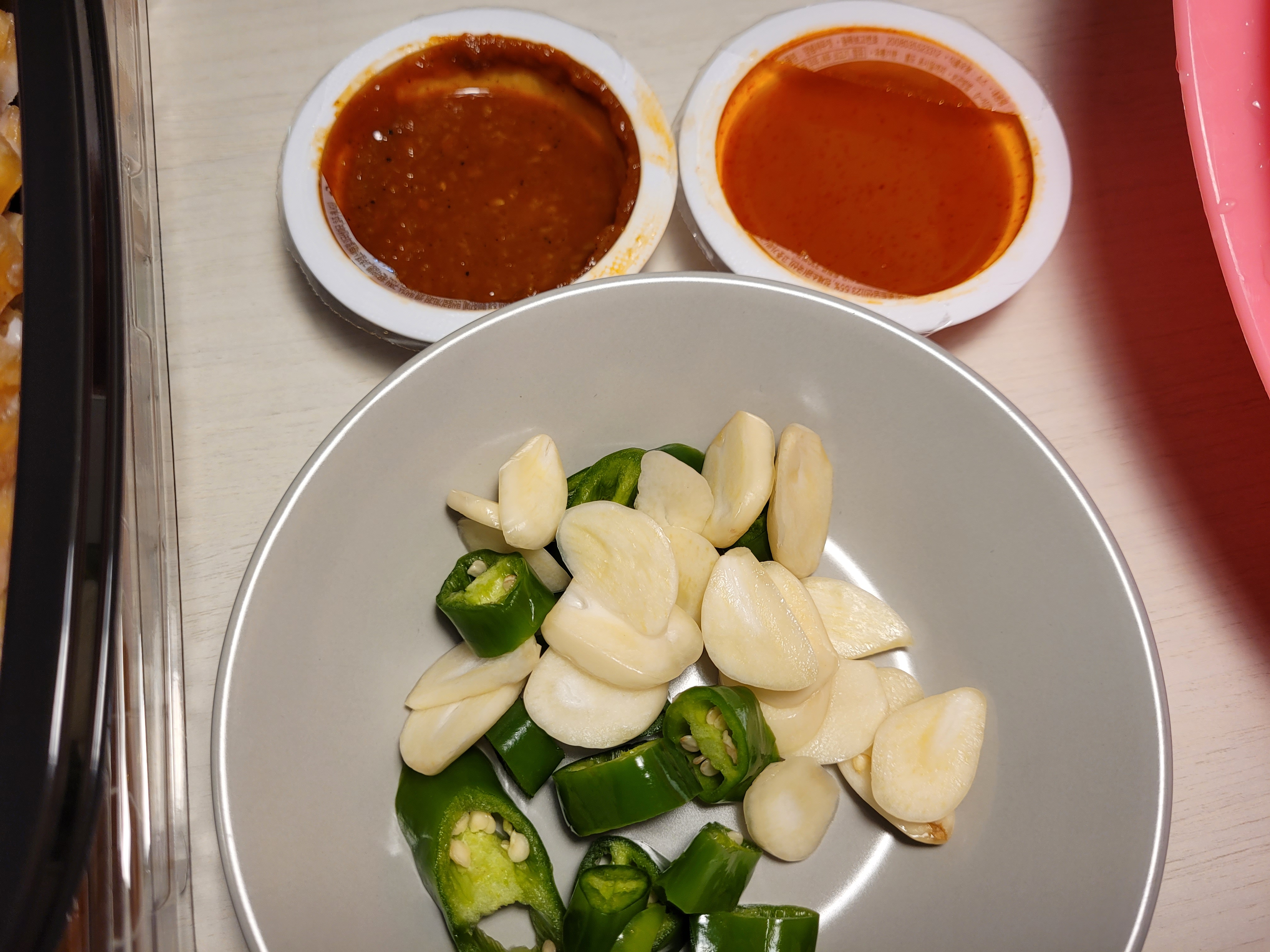 마늘과 고추, 새우젓, 쌈장도 같이 들어있어요.