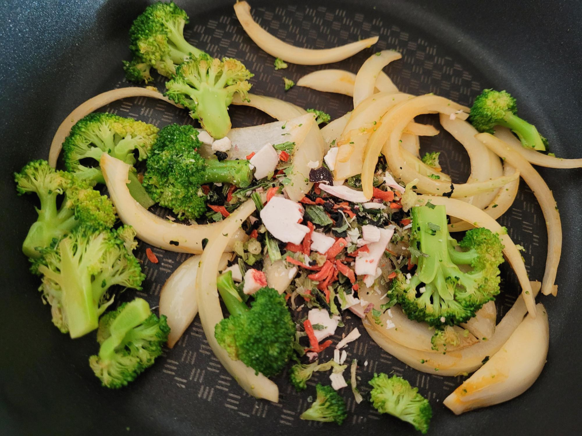 저는 양파와 브로콜리가 있어서 채썰어 넣어주었고요. 마늘은 다진마늘로 살짝 넣었어요.