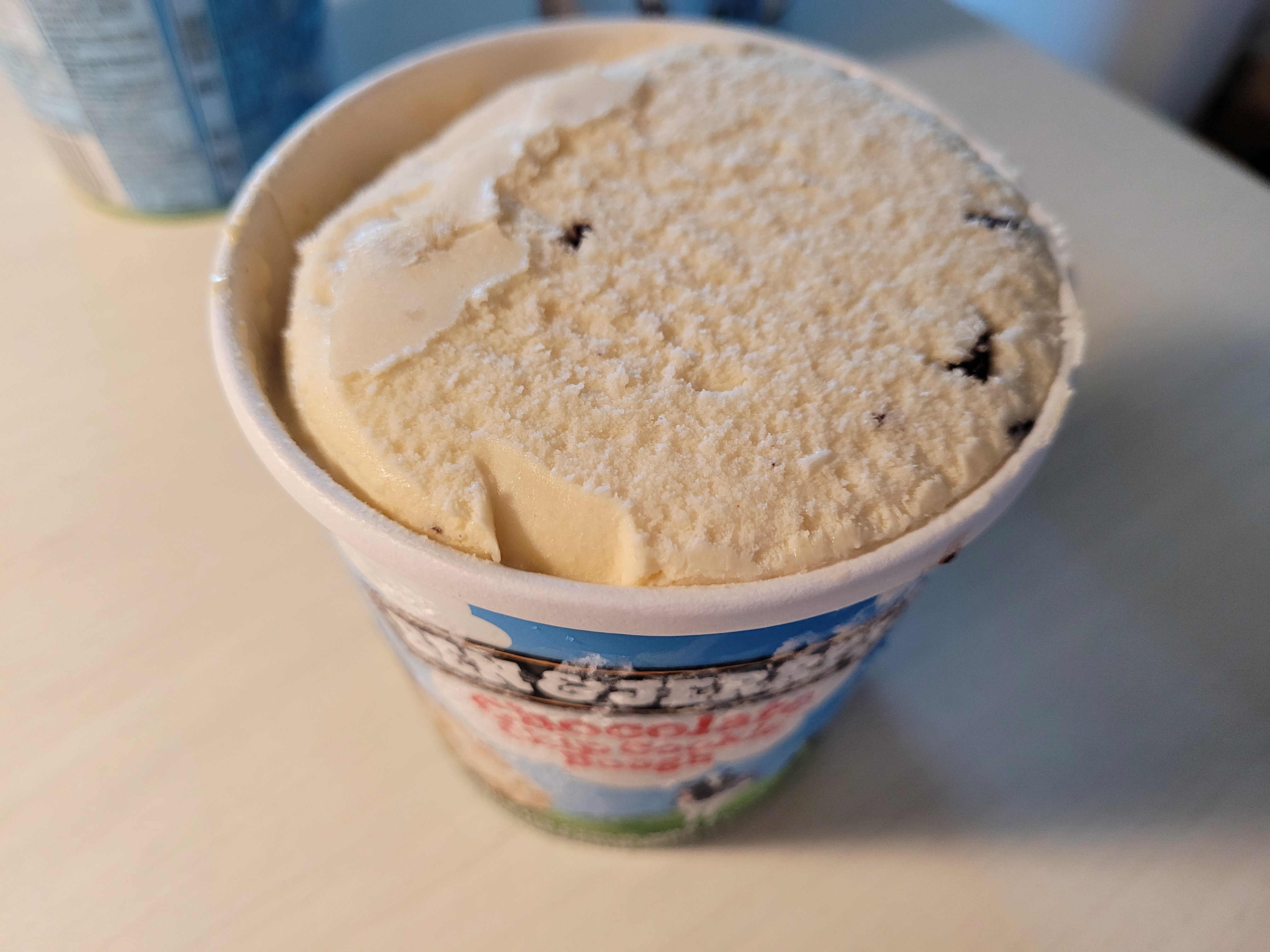 바닐라 맛 아이스크림 베이스에 초콜릿 칩과 쿠키 도우가 들어간 겁니다. 초코칩과 쿠키도우 조각이 같이 씹히면서 엄청 단 맛이 느껴집니다.