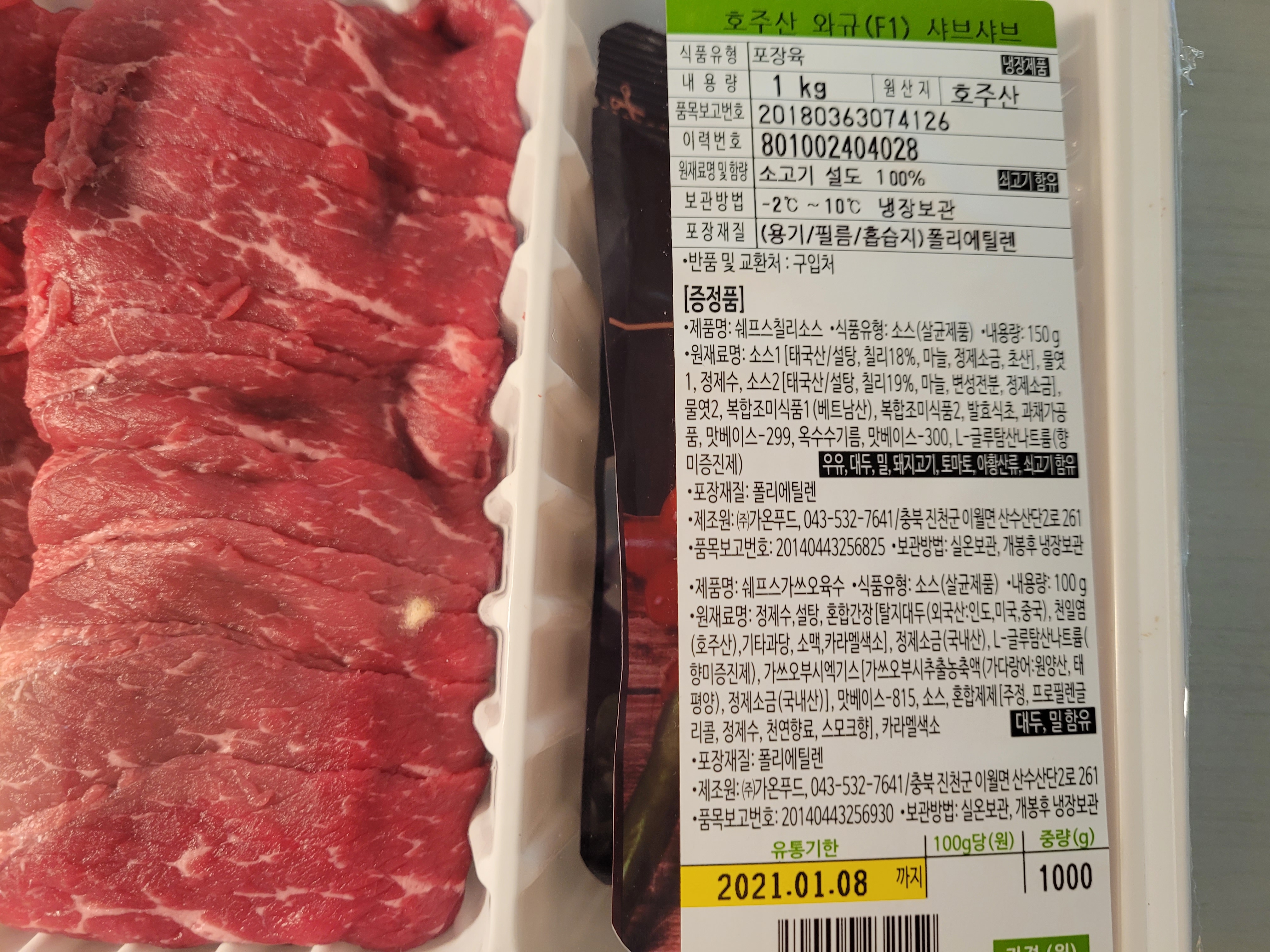 이 호주산 샤브샤브용 소고기의 장점은 칠리소스랑 가쓰오부시 육수액이 같이 들어있어요!!