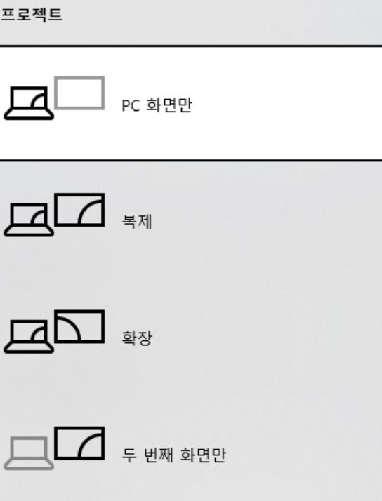아래와 같이 'PC 화면만'으로 설정하면 주 모니터로 사용하고 있는 화면만 사용할 수 있습니다. 디스플레이 확장 선택했을 때 마우스가 넘어가거나, 새창이 보조 모니터에 뜨거나 주 모니터 화면에서 벗어나는 것을 방지할 수 있습니다.