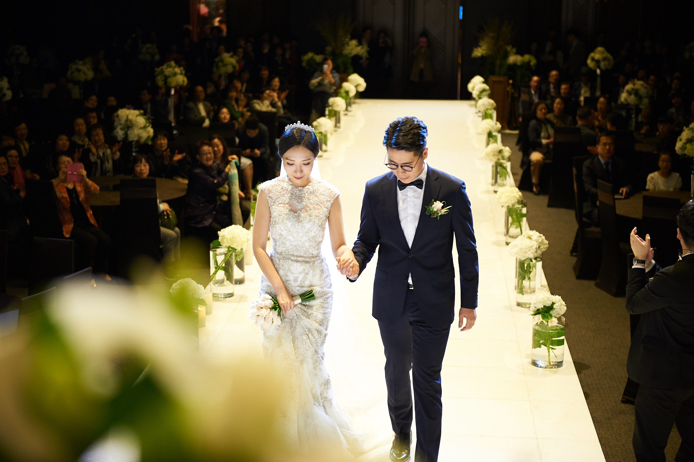 어두운 홀이고, 신랑신부가 입장할때나 행진할땐 조명을 다끄고 하이라이트 조명으로 주인공들을 비춰주고요.