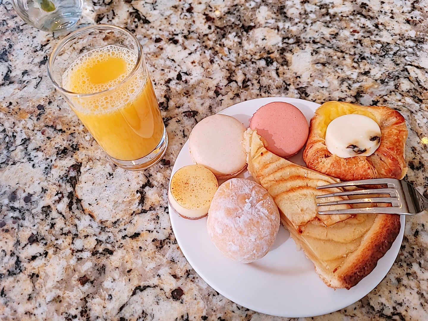마카롱 두종류, 도넛, 치즈케이크, 애플파이, 빵 2~3종류 정도 준비되어있었고, 쿠키 2~3종류가 있었어요.