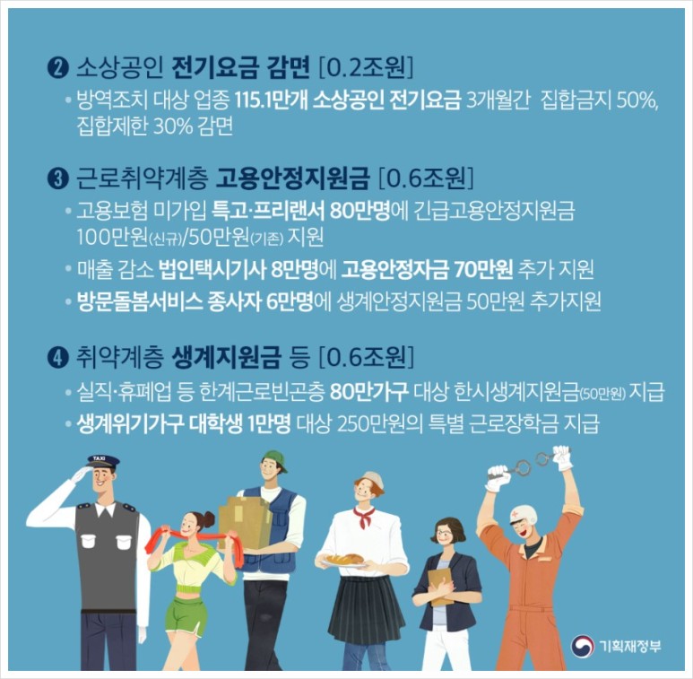 방문돌봄서비스 종사자는 70만 원, 법인택시 기사도 50만원까지 받을 수 있으며, 한계근로빈곤층, 노점상은 50만원까지 지원합니다.