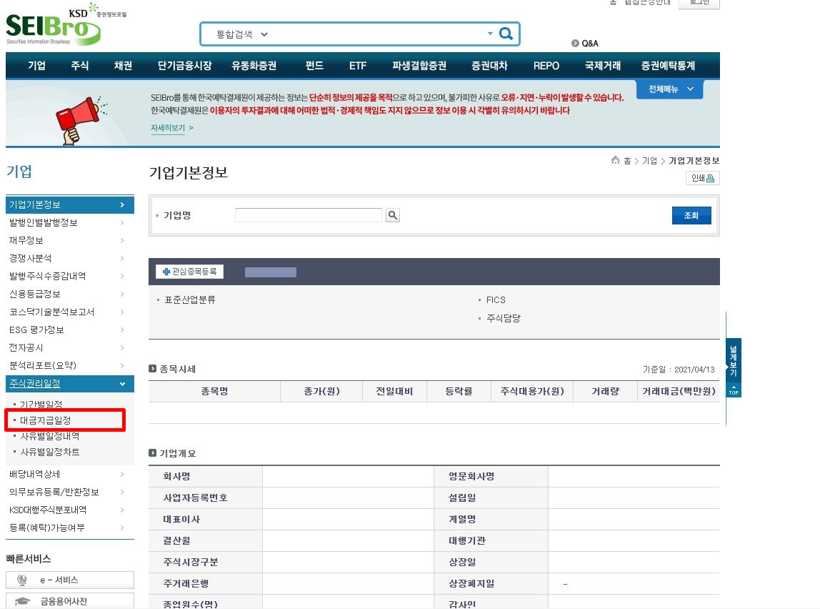 #2. '기업'탭을 누르고 난 후 아래 빨간 네모칸 표시와 같이 주식권리일정 -> 대금지급일정을 클릭합니다.